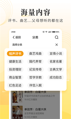 "书香门第:自从给老父亲安装了这个软件,他每天都要听两小时评书,操作特别简单,字大看得清"