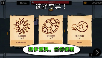 游戏采用单指触控的极简操作模式,通过点击屏幕控制角色在墙壁、天花板之间进行三维移动。动态变异系统是最大特色,每次吞噬生物后可从随机出现的三种变异能力中选择强化方向。超过20种实验室生物各具特色,从携带护盾的龟甲兽到释放电流的电视蜗牛,每个敌人都需要针对性策略应对。