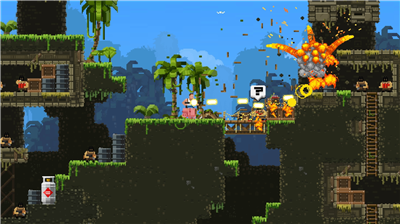 游戏突破传统横版关卡设计,所有场景元素均可通过爆炸破坏。玩家既可摧毁建筑制造掩体,也能爆破地面创造新路径。特别设计的攀爬系统让角色可附着在任何垂直表面,配合二段跳跃等特殊动作,形成立体化战术空间。