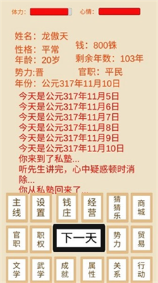 3、多维成长系统:涵盖官职晋升、文学修养、武艺锤炼等十二项能力维度,人物关系网与成就体系交织出千人千面的成长轨迹。