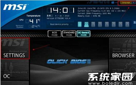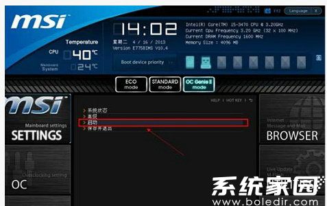 4、使用方向键或鼠标指针选择SETTINGS主控模块,该选项在光标悬停时会呈现高亮显示状态。