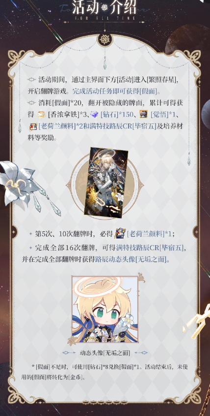 活动期间每日登陆及完成指定挑战可获得[假面]道具,消耗该道具可逐步解锁神秘卡牌矩阵。卡牌背面隐藏着包括钻石、觉悟素材、老荷兰颜料等常规资源,更有路辰限定CR卡[毕宿五]等待揭晓。建议玩家优先完成每日限时任务以最大化道具获取效率。