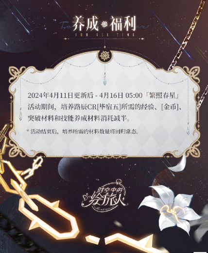本次特别开放路辰CR[毕宿五]专属培养增益:角色经验获取效率提升100%、金币消耗降低50%、突破素材需求减半、技能升级材料用量缩减50%。建议玩家集中资源在此期间完成该角色的完整培养体系构建。