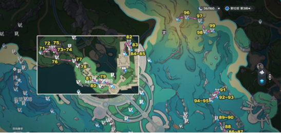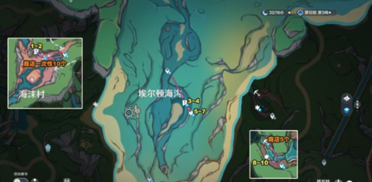 该区域特产共计114个,其中99个可通过野外采集获得。建议沿枫丹廷西北海岸线展开地毯式搜索,潮汐变化区域需注意水位变化规律。特殊标记点解析:牛头图标代表单个产出点,叹号标记有双倍产出,六角星位置可获取3个,鸡腿标记点则有4个集中产出。