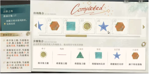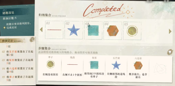 本关包含16步组合操作:单子起手后接五芒星→六边形→矩形→线段→五芒星→六边形→单子→矩形→六边形→三角形→五芒星→六边形→矩形→单子→五芒星→六边形。当遇到符号共鸣震动时,需快速连续点击当前符号三次以稳定装置。