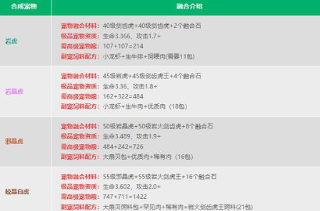 岩虎作为虎系起点需双剑齿虎融合,注意岩晶虎虽初始配方相同,但需区分剑齿虎亚种。邪晶虎阶段需岩火剑齿虎参与,最终皎晶白虎必须使用55级邪晶虎与岩火剑虎王进行合成,完整进化链可解锁白虎专属破甲能力。