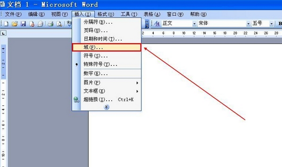 1、启动Word程序后定位插入位置,在顶部菜单栏选择"插入"选项,展开高级功能面板后选择"域"功能模块(若未直接显示可点击扩展箭头查找)。