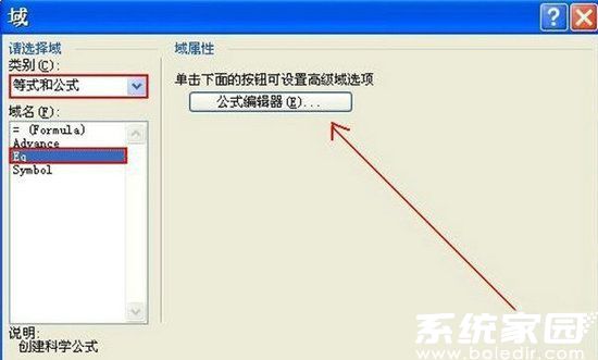 3、在分类选项中选择"等式和公式"类型,从域名列表里选取"Eq"域代码,点击右侧的公式编辑器按钮激活数学符号输入界面。