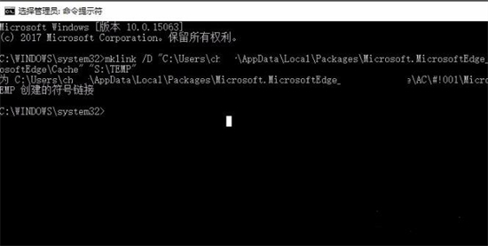 3、创建符号链接:在命令窗口输入「mklink /D "原始缓存路径" "新存储路径"」格式指令,特别注意路径参数间的空格设置。示例命令:mklink /D "C:UsersAdminAppDataLocalPackagesMicrosoft.MicrosoftEdge_8AC#!001MicrosoftEdgeCache" "D:BrowserCacheEdge"