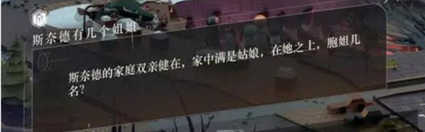在《重返未来1999》的剧情推进过程中,玩家会遇到需要解谜的互动环节。当涉及斯奈德这个角色时,系统会提出关于其家族成员的特殊问题。根据官方设定资料显示,斯奈德出生于一个结构特殊的大家庭,这个设定不仅丰富了角色背景故事,更与后续剧情发展存在密切关联。