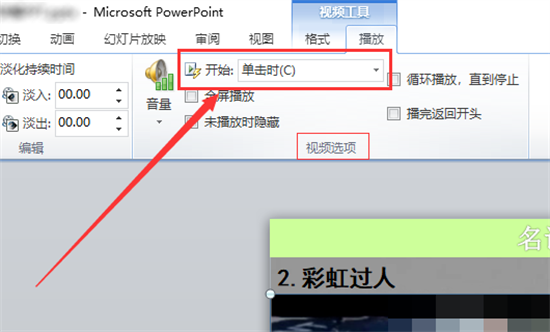4、进入视频参数设置核心区域。在"视频选项"组中找到"开始"下拉菜单,此选项控制视频的触发机制,是实现自动播放的关键配置节点。