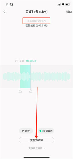 3.进入音频截取界面后,通过滑动时间轴精准选取30秒内的精华段落。建议选择副歌或记忆点明确的部分,同时注意保持音频波形完整性