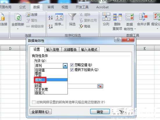 3、在弹出的参数设置窗口中,将验证条件中的「允许」类型调整为「序列」选项。此设置将单元格输入内容限定为特定选项列表,为后续复选框功能实现奠定基础。