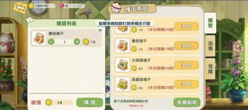 进入交易界面后,选择蔬菜种子分类,滑动至番茄种子项即可进行购买操作。建议每日关注库存刷新机制,系统每日供应量存在上限,合理规划采购数量才能保障持续生产。特别注意种子包装标注的生长周期参数,不同批次种子可能存在细微差异。