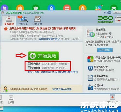 4、选择扫描策略模式:系统提供两种深度处理方案——「强力模式」侧重关键区域快速扫描,适用于紧急救援场景;「全盘扫描」则进行全方位系统体检,推荐定期维护使用。选定模式后点击「开始急救」按钮,程序将自动执行修复操作。