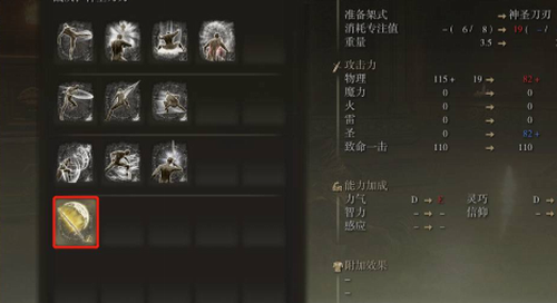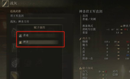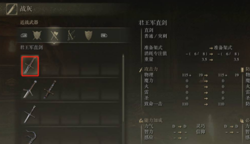 2 进入装备改造界面后,需注意武器类型适配规则。直剑类武器可适配80%常规战灰,特大武器则存在特殊限制。选中目标武器时,系统将自动筛选可用战灰列表。