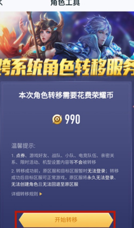 进入角色迁移界面后需仔细阅读转移规则,确认符合条件后支付990荣耀币(折合人民币99元)即可发起申请。需特别注意的是:账号需处于离线状态、点券余额须清零、需提前退出战队及小队等社交组织。