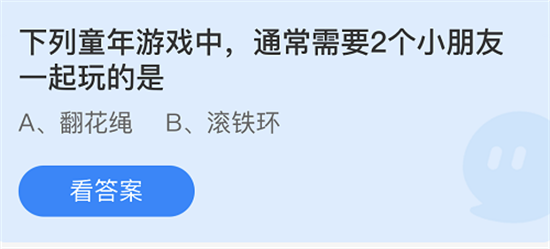 第一道题目围绕童年游戏展开:"下列童年游戏中通常需要2个小朋友一起玩的是?"正确答案为传统民间游戏"翻花绳"。这种通过棉线绳变换造型的互动游戏,需要参与者通过手指的勾、挑、翻等动作轮流创造不同图案。游戏中蕴藏着培养协作能力与空间想象力的教育意义,至今仍是跨代际的文化传承载体。