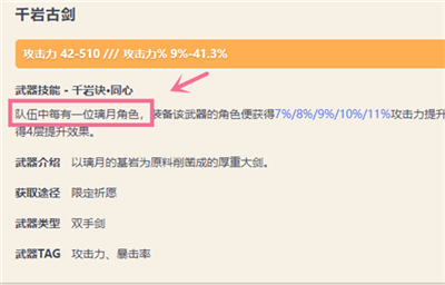 该武器的核心价值体现在「队伍中每存在一位璃月籍角色,装备者将获得攻击力7%/8%/9%/10%/11%提升与暴击率3%/4%/5%/6%/7%加成」的特殊效果。这意味着当组建全璃月队伍时,最高可叠加四层效果,提供高达44%攻击力与28%暴击率的恐怖增幅,这种成长型机制使其成为特定阵容的战术核心。